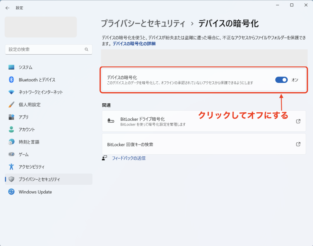 設定画面のタブから「プライバシーとセキュリティ」→「デバイスの暗号化」をクリックしましょう