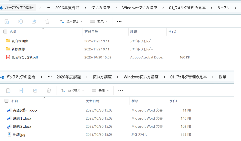 ①エクスプローラーを起動し、【Windows使い方講座>01_フォルダ管理の見本】の中身を見てみよう