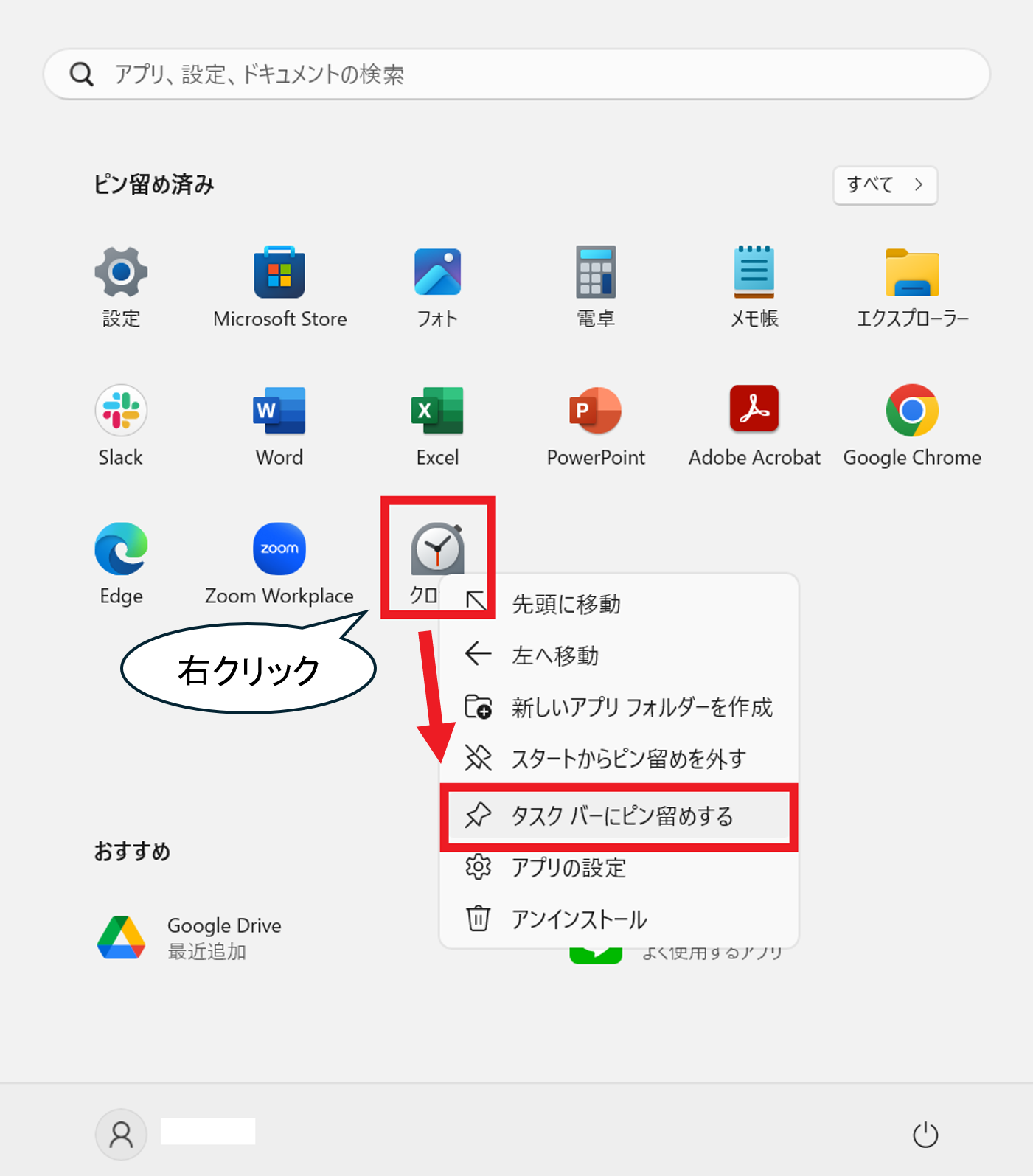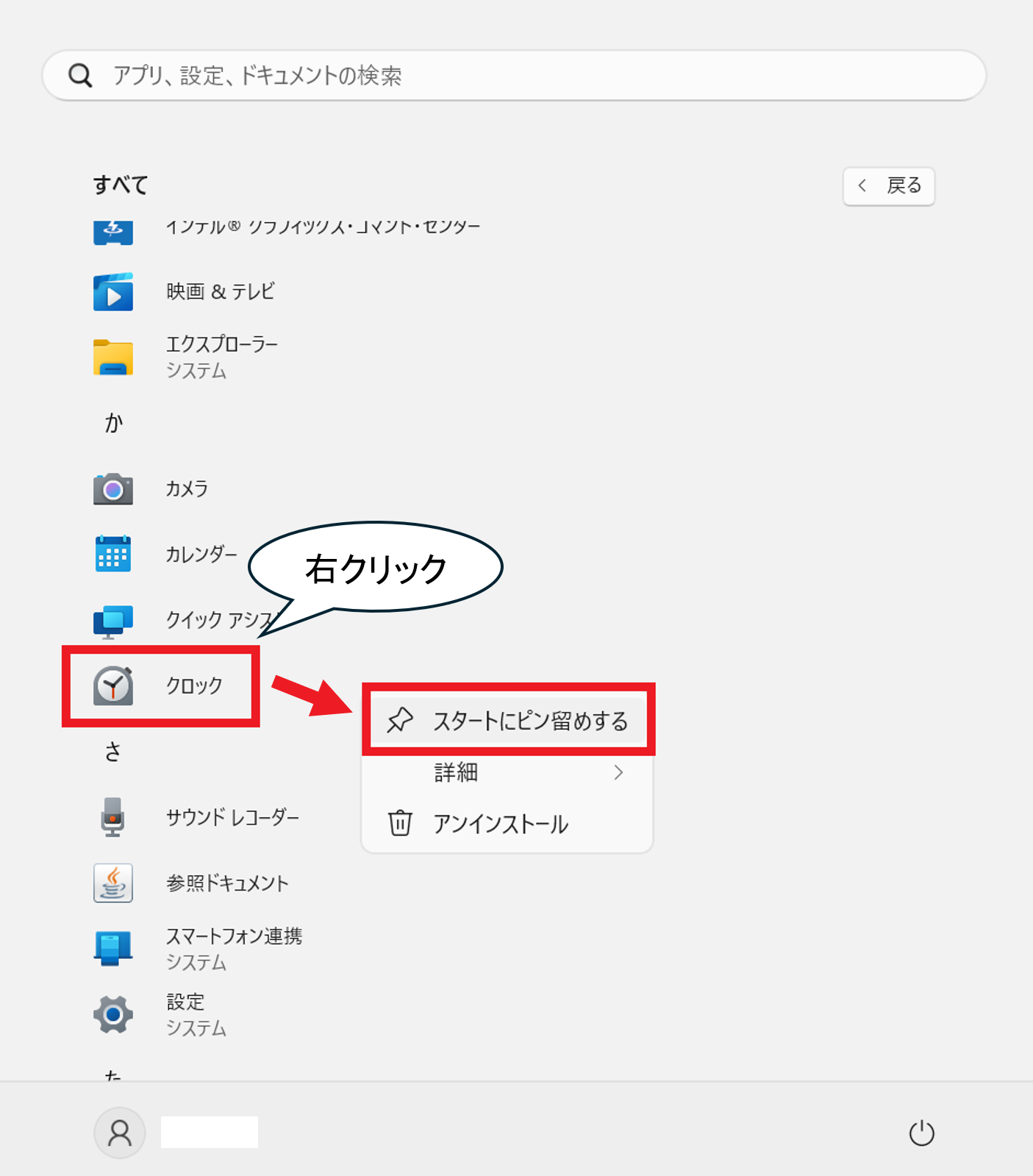 ①Windowsロゴをクリックして、「クロック」をピン留めしよう!