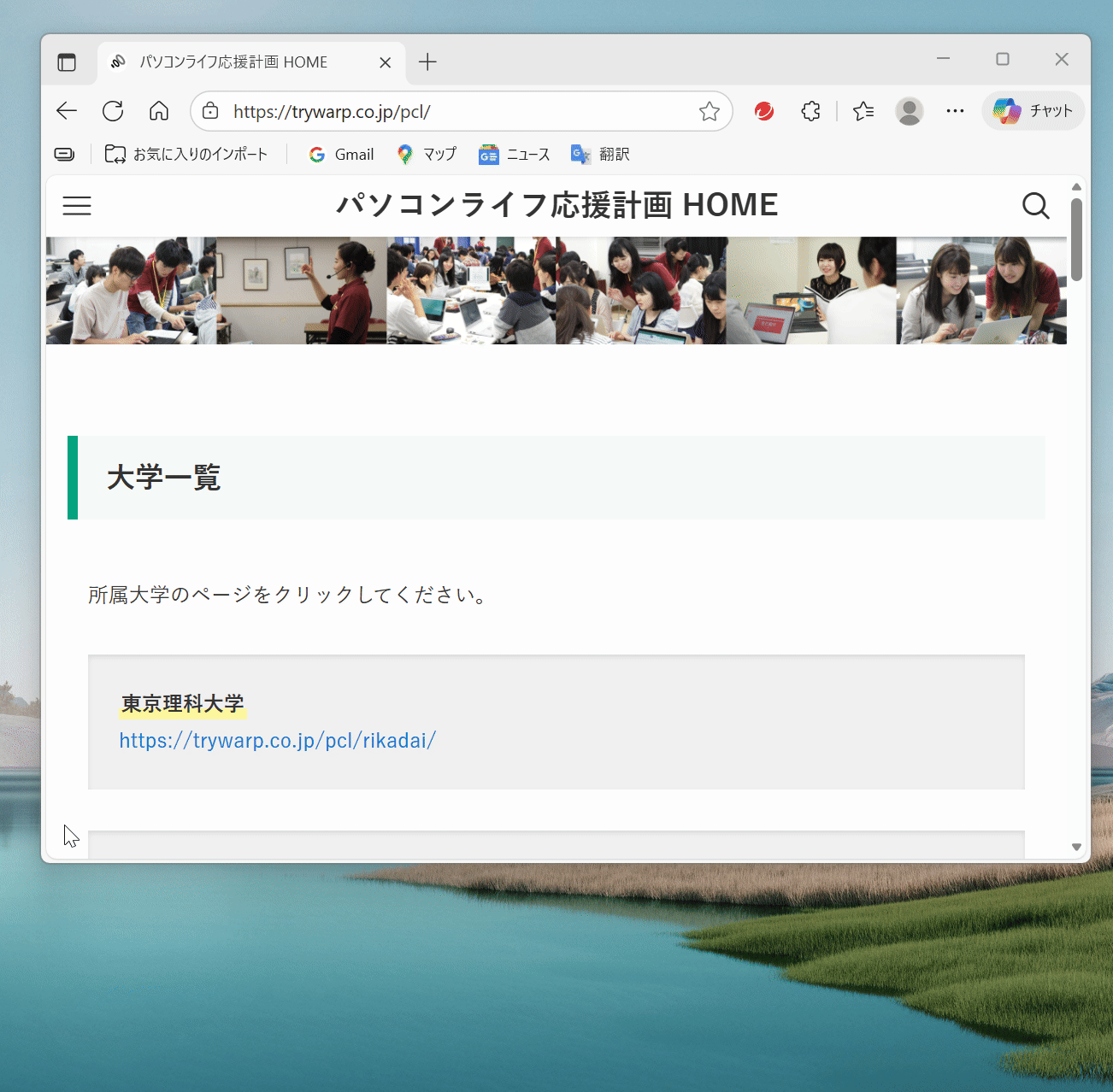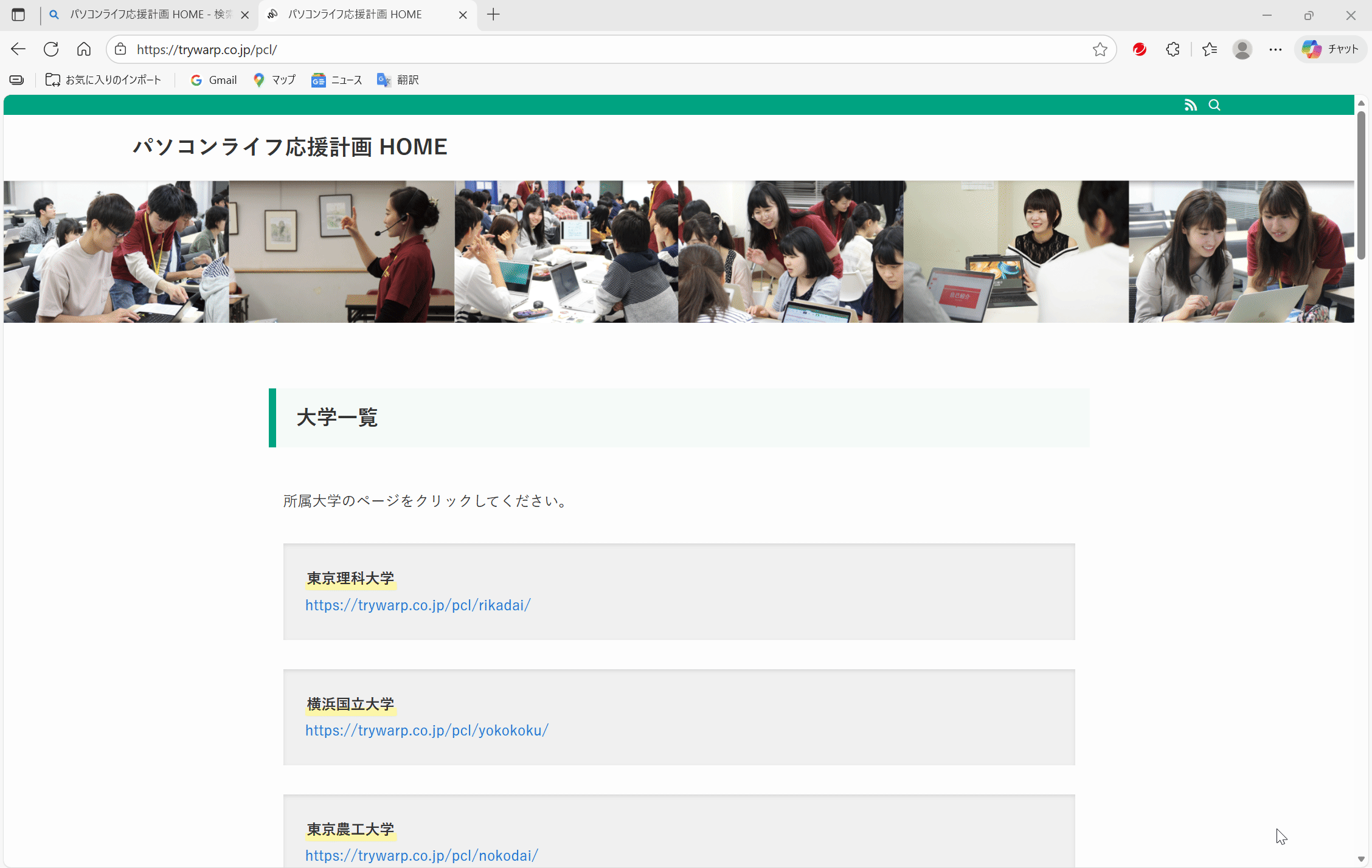 ①Step1で開いた「パソコンライフ応援計画 HOME」のサイトから自分の大学のページに移動しよう
